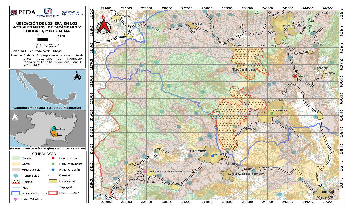 En este sentido, y a manera de ejemplo de las habilidades que se obtuvieron durante el desarrollo del curso, se quieren compartir dos mapas que se han realizado recientemente, post-curso, relacionados con el tema de investigación. El primero de ellos corresponde a un encuadre de la región Tacámbaro-Turicato, geolocalizando cuatro haciendas azucareras, en estrecha relación con las características hidrográficas, de usos de suelo y topográficas, en la franja central del estado de Michoacán.